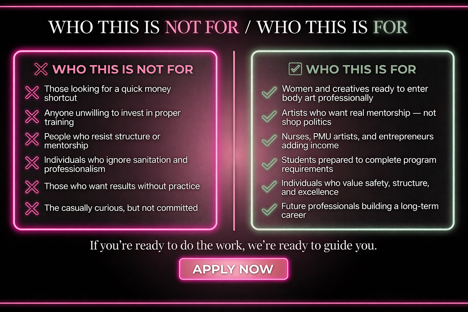 Our classes are held in the evenings to support women who have jobs, families, or busy schedules. Whether you’re coming straight from work or juggling multiple responsibilities, you can still build your tattoo career without sacrificing your life.